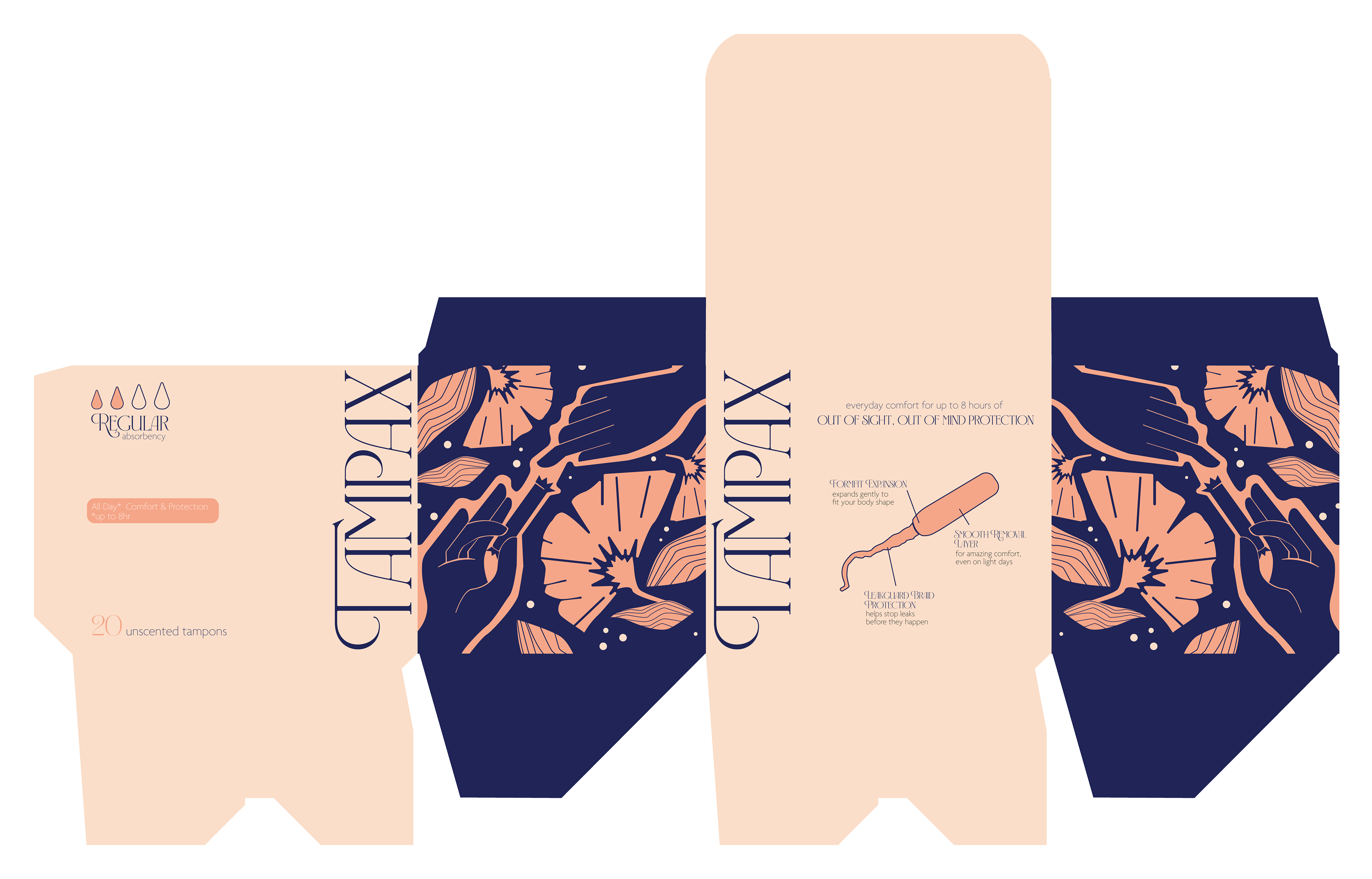 Feminine Products tend to have the same outdated packaging. As a passion project, I redesigned the Tampax boxes to bring a level of sophistication and fun to something many young girls find embarrassing to bring to the register for the first time.